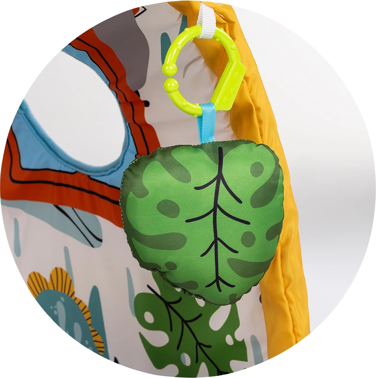 - Stimulare senzorială: culori contrastante, jucării suspendate și ferestruici pentru peek-a-boo.