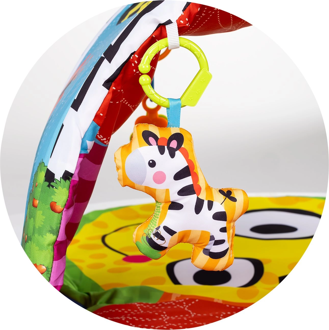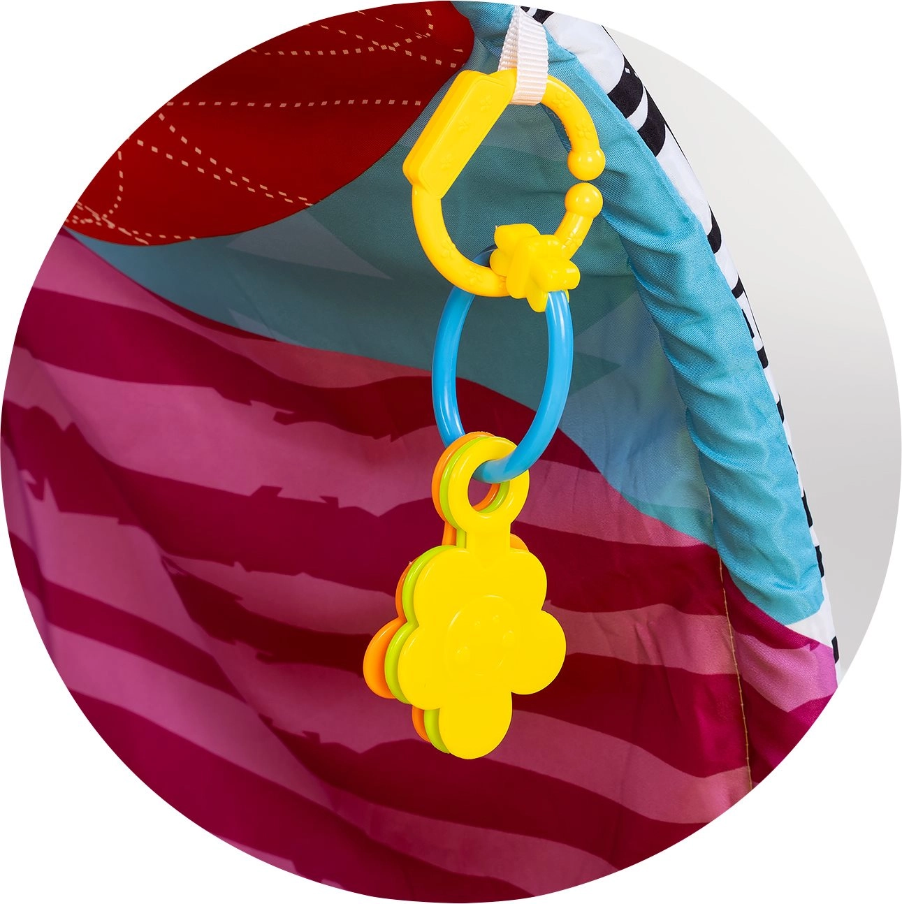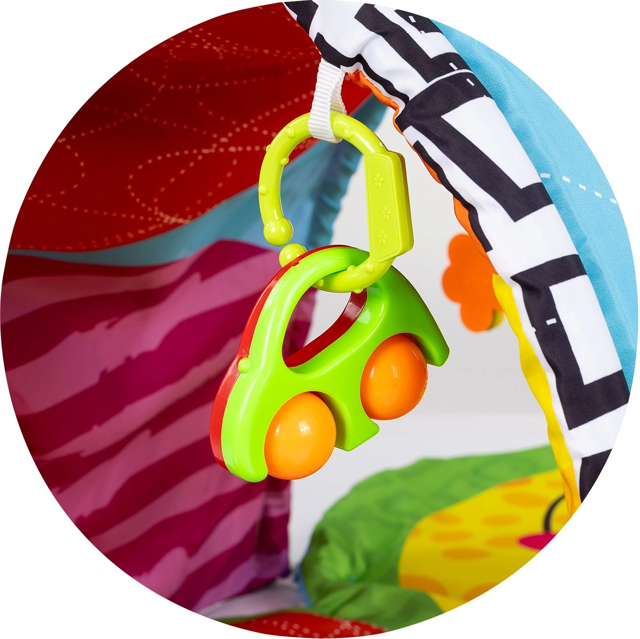Jucăriile detașabile cu prindere tip clip, cu zornăitoare și texturi, susțin prinderea, explorarea și stimularea vizuală și pot fi atașate pe arcadă sau pe cărucior.