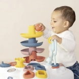 Copiii vor îndrăgi elementele pline de culoare: labirintul cu mărgele, rotițele dințate rotative, turnul pentru bile și sortatorul de forme. Fiecare activitate este creată pentru a susține dezvoltarea motorie, răbdarea și înțelegerea relației cauză–efect.