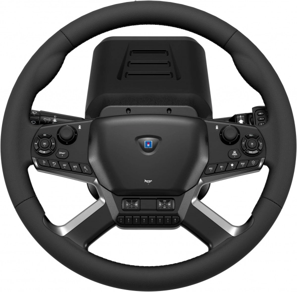 Volan de 40 cm cu suprafață din piele sintetică și un unghi de rotație de 1800° oferă o senzație autentică de condus al vehiculelor grele atât pe șosea, cât și în depou.