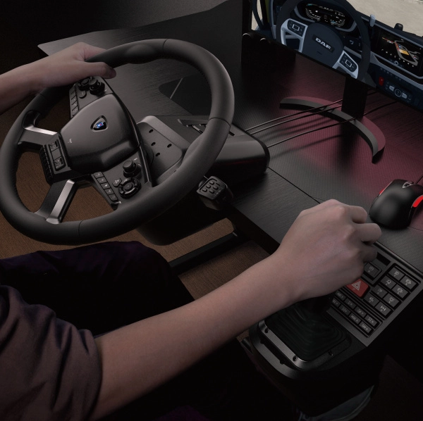 Sistemul HORI Force Feedback Truck Control pentru PC este proiectat pentru realism maxim și confort pe trasee lungi. Volanul de dimensiune completă cu piele sintetică și rotație de 1800° simulează fidel un camion real, în timp ce motorul dual Force Feedback redă cu precizie greutatea, tracțiunea și suprafețele carosabilului. Manetele integrate pentru lumini și frâne, împreună cu un set bogat de butoane, îți oferă control direct și rapid asupra tuturor funcțiilor.