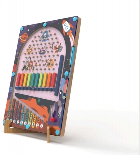 Descoperă un joc distractiv și inteligent pentru copii: pinball magnetic din lemn cu tematică spațială, care oferă 2 jocuri în 1 – pinball clasic cu lansarea bilelor și joc magnetic de acumulare a punctelor. Tabla colorată susține motricitatea fină, coordonarea mână–ochi, răbdarea și gândirea logică. Datorită suportului, jocul se așază ușor pe masă, iar copiii învață natural să numere punctele.