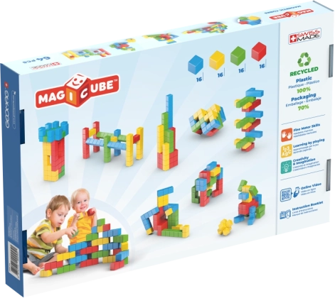 GEOMAG MAGICUBE set creativ cu 64 de piese: cuburi magnetice care se atrag pe toate cele 6 laturi, construcții 3D, plastic 100% reciclat, de la 1 an, fabricat în Elveția.