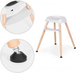 Centura în 5 puncte, elementul dintre picioare și picioarele din lemn stabile, cu capete antiderapante, protejează copilul de alunecare și asigură stabilitate maximă.