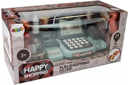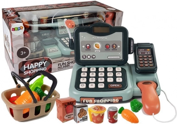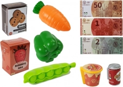 În pachet găsiți tot ce aveți nevoie: casă de marcat cu cântar și cititor de carduri, scanner manual, coș, jucării-alimente (biscuiți, suc, apă, înghețată, cola, legume), card de plată, bancnote și 6 monede din plastic. Jocul este astfel cât se poate de realist și dezvoltă imaginația copiilor și motricitatea fină.