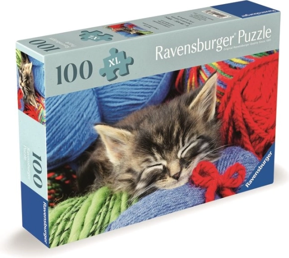 Puzzle Ravensburger Pisică cu ghem XXL, 100 piese. Piese mari de calitate, culori intense și dimensiune finală 49 × 36 cm. Distracție grozavă pentru copii.