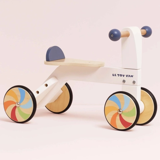 Vehicul de împins din lemn LE TOY VAN cu roți curcubeu din lemn FSC®. Vopsele sigure, șezut confortabil și manevrare ușoară. Ideal pentru copii 1,5+.
