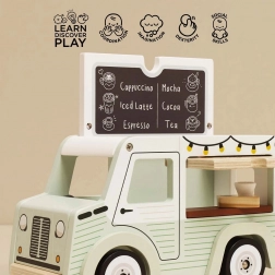 Descoperiți farmecul unei cafenele pe roți în variantă pentru copii. Cafeneaua mobilă Le Toy Van Street Coffee se remarcă prin verdele fistic delicat și alb, ilustrații detaliate și funcții gândite atent, care îi introduc pe copii în lumea imaginației. Acoperișul se deschide ușor, iar în interior găsiți meniul cu ofertă de cafea și ceai; fereastra frontală de servire permite deservirea „clienților” ca într-o cafenea reală.
