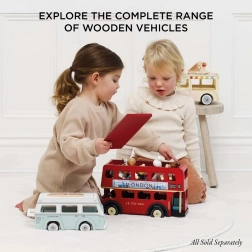 Jucăria este realizată din lemn certificat FSC și pictată manual cu vopsele ecologice pe bază de apă. Este sigură, durabilă și concepută pentru a dezvolta abilități sociale, comunicarea și imaginația.