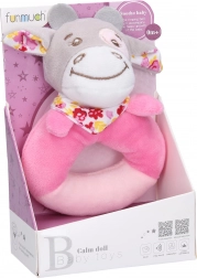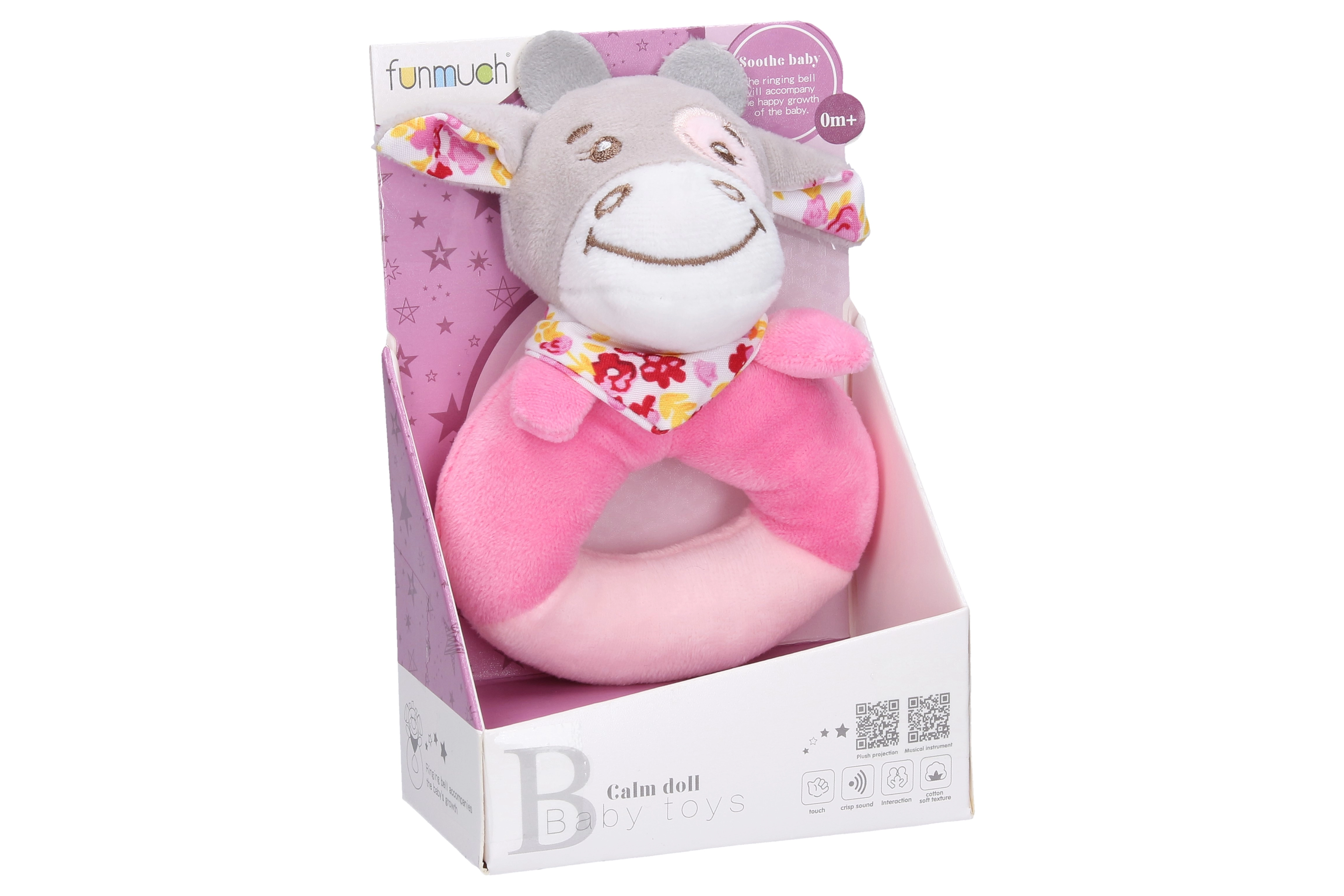 Zornăitoare drăgălașă din pluș, în formă de inel, cu motiv de văcuță, care încântă bebelușii prin moliciune și sunetul plăcut. Ideală pentru primele descoperiri, prindere și dezvoltarea motricității. Pluș moale, prindere ușoară și zornăit delicat care susțin percepția senzorială.