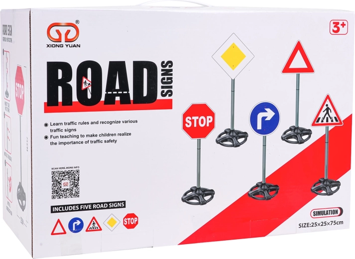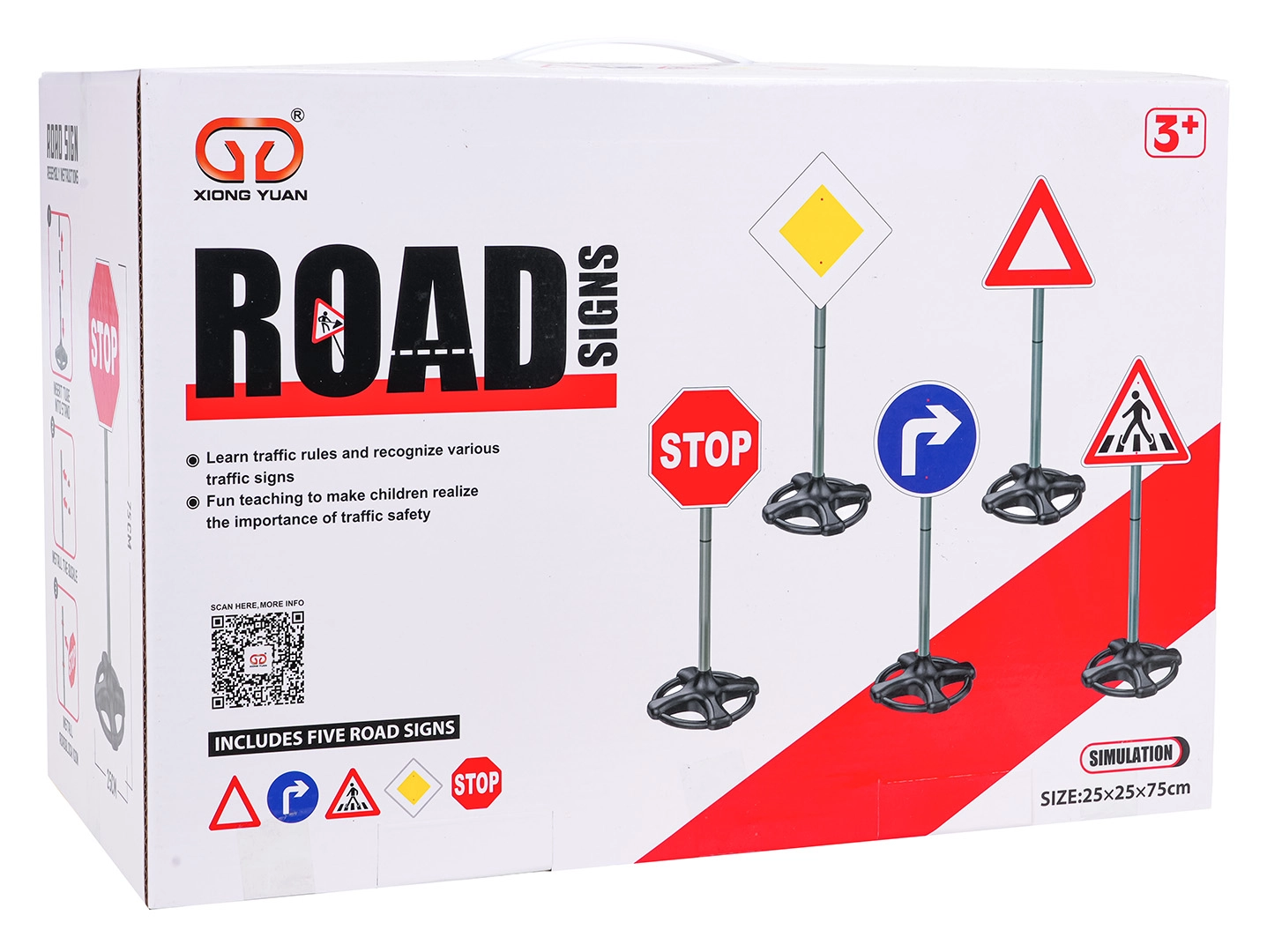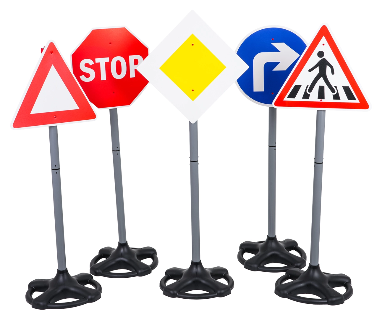 Această mega set conține cinci indicatoare rutiere realiste cu înălțimea de aprox. 75 cm. Copiii învață prin joc regulile de bază ale siguranței și orientarea în trafic. Construcția robustă, din plastic ușor, cu baze stabile, încărcate asigură utilizare sigură în interior și exterior.