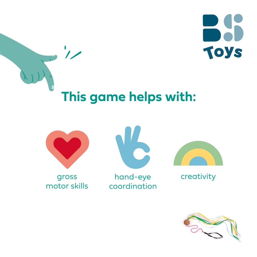 Se potrivește perfect pentru joaca acasă, pentru afterschool și pentru cercurile de educație fizică. Panglicile lungi asigură un efect vizual atrăgător, în timp ce bila din plută oferă o greutate plăcută și sigură pentru o rotire lină.