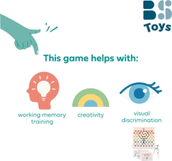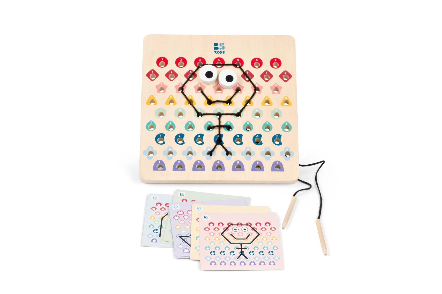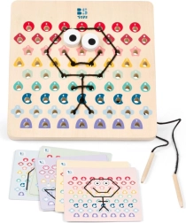 Descoperă un set didactic distractiv pentru micii creatori: placă din lemn perforată, șnururi și carduri cu modele, datorită cărora copiii creează motive frumoase după coduri de culori. Jocul dezvoltă motricitatea fină, gândirea logică, imaginația vizuală și creativitatea – de la sarcini simple până la codificarea mai avansată a modelelor.