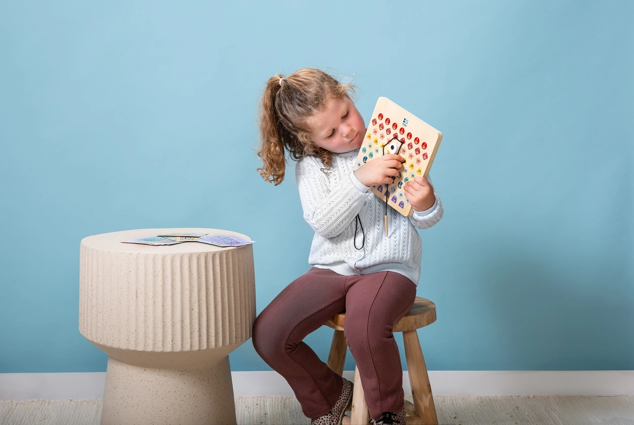 Broderia codificată este o activitate inteligentă și amuzantă, care îi introduce pe copii în lumea culorilor, formelor și a modelelor. Este suficient să urmeze codurile de culori de pe carduri și să treacă șnururile prin placa perforată din lemn pentru a obține motive precise și impresionante. După finalizare, cardul poate fi întors pentru a verifica ușor corectitudinea modelului creat.