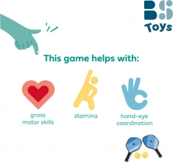 În pachet găsești echipamentul complet pentru 2 jucători: 2 palete din lemn (40 × 19 cm), 2 mingi, fileu portabil și geantă pentru depozitare și transport ușor. Regulile se învață în câteva clipe și poți juca chiar și pe un teren mai mic – de exemplu în curtea școlii sau în sală.