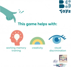 Setul include o bază solidă din lemn și seturi de șabloane cu dificultate progresivă. Jocul este ideal atât pentru distracția de acasă, cât și pentru activități educaționale preșcolare – copiii învață într-un mod ludic să lucreze cu forme, culori și spațiul.