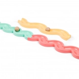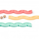 Trei părți colorate, cu canale curbe, se conectează ușor în trasee diverse. Modelarea variabilă menține jocul captivant și stimulează imaginația.