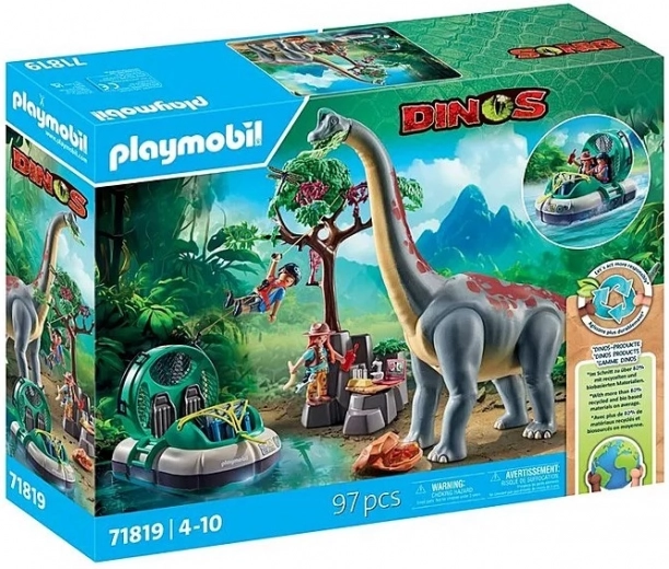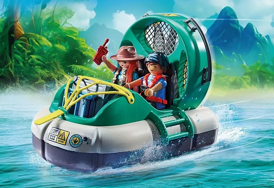 Hovercraftul găzduiește două figurine PLAYMOBIL și permite explorări realiste pe apă și deplasări rapide după dinozauri.