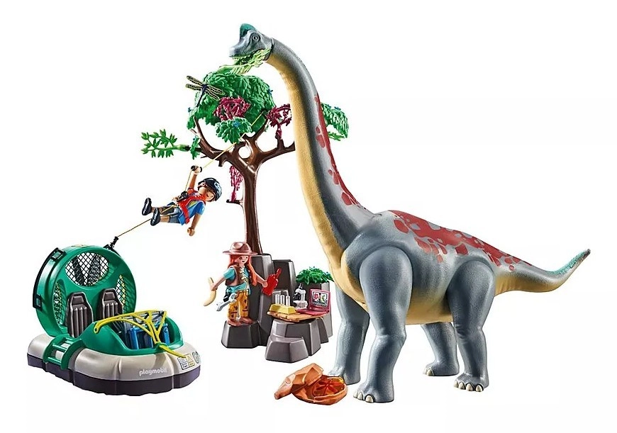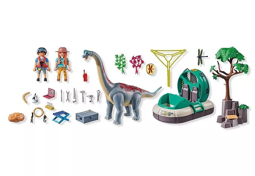 Brahiosaurul are mandibulă mobilă și detalii realiste, iar copacul oferă frunze detașabile pentru hrănire interactivă. Setul include și „comori ascunse”, de exemplu o libelulă prinsă în chihlimbar, unelte, frânghii, plase și echipament de cercetare inclusiv un laptop pentru documentarea comportamentului.