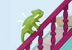 Descoperă ascunzătoarea de sub scări, peștera primitoare și simpaticul cameleon care se prinde de balustradă și înveselește orice joc.
