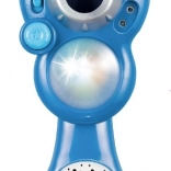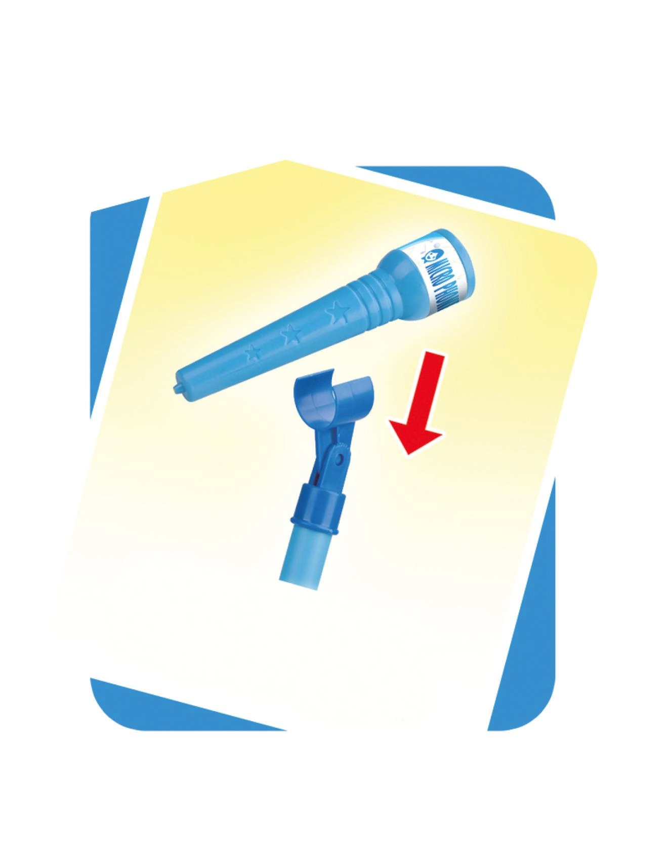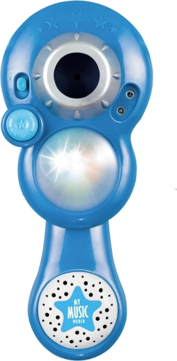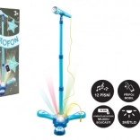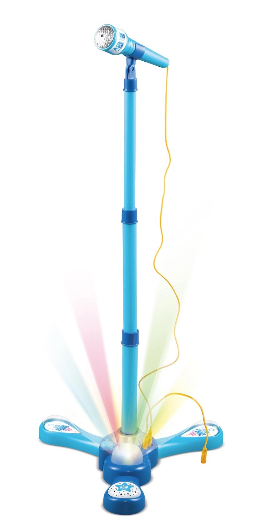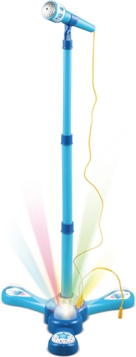 Microfon karaoke distractiv pentru copii, cu stativ, aduce la orice petrecere efecte luminoase colorate, 12 melodii integrate și posibilitatea de conectare a unui MP3 sau telefon mobil. Datorită înălțimii ajustabile de 40–80 cm, crește odată cu copiii și le susține încrederea în sine și dragostea pentru muzică.