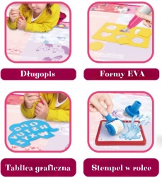 - Covoraș cu apă, markere cu apă, șabloane, ștampile, accesorii creative, forme colorate