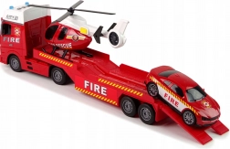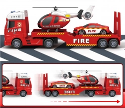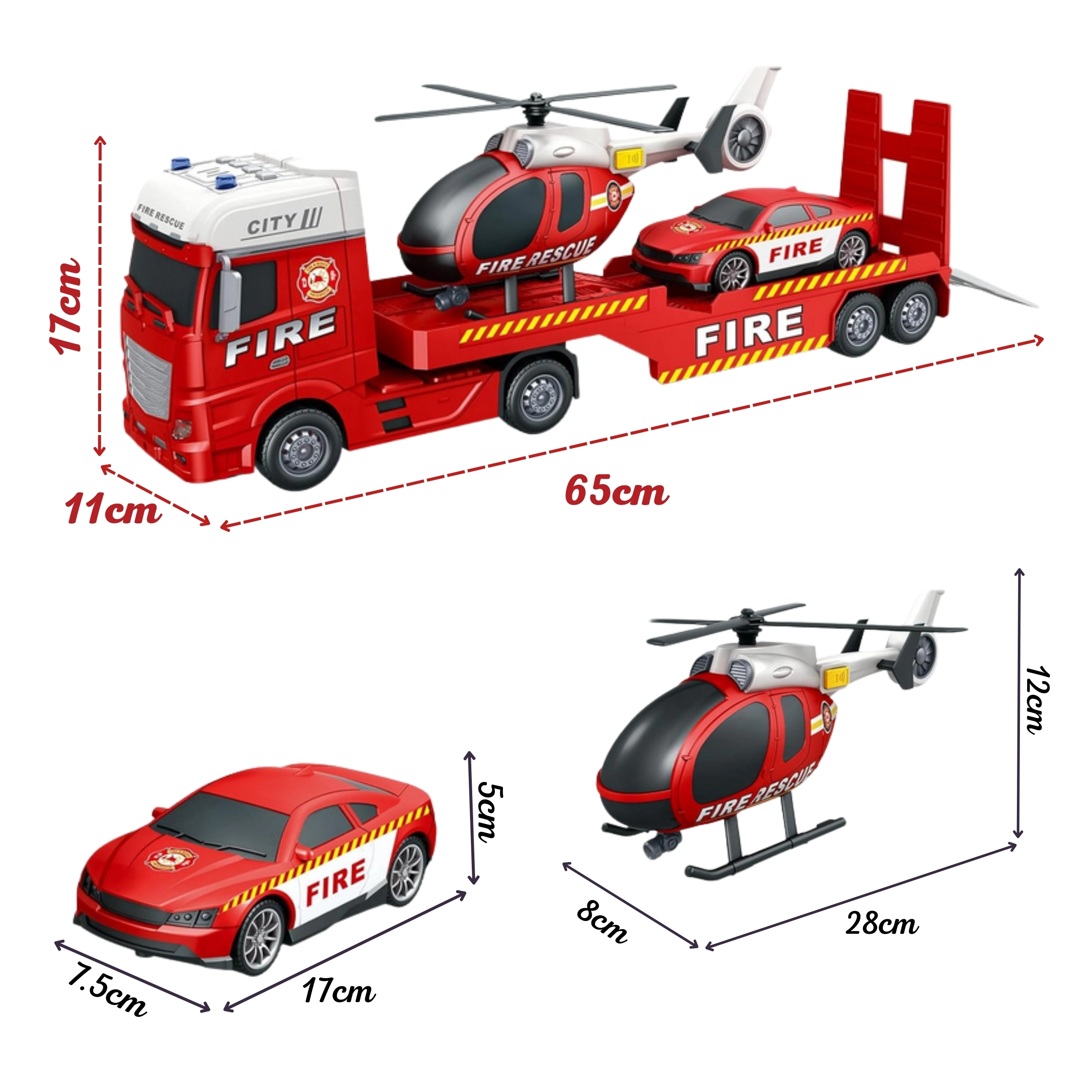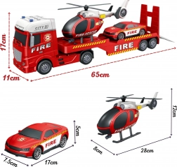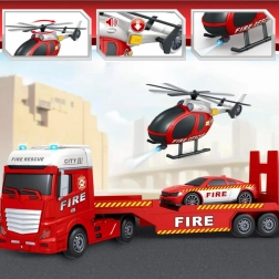 - Conținutul pachetului: camion remorcher cu spațiu pentru transportul mașinilor, mașină de pompieri, elicopter cu rotor mobil.