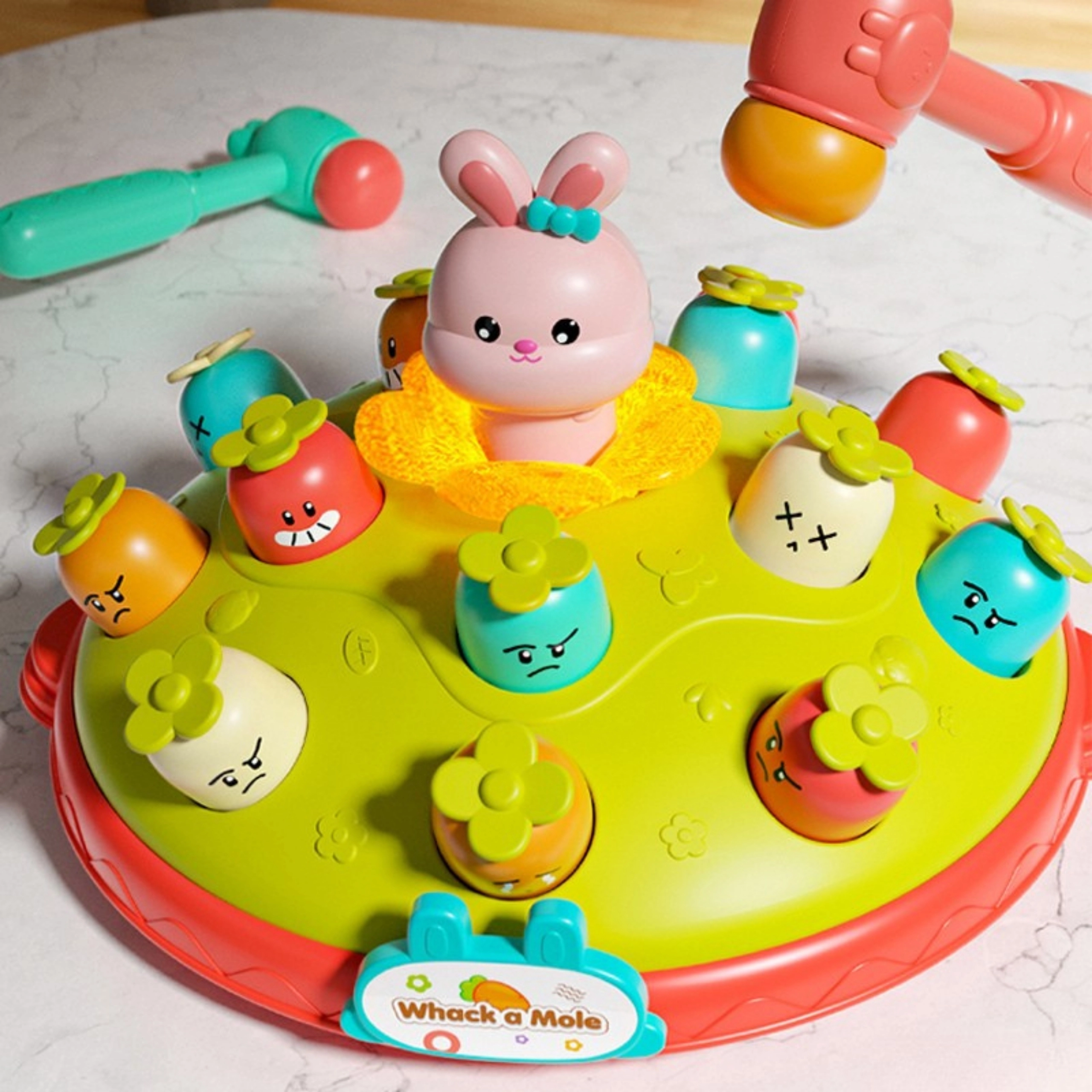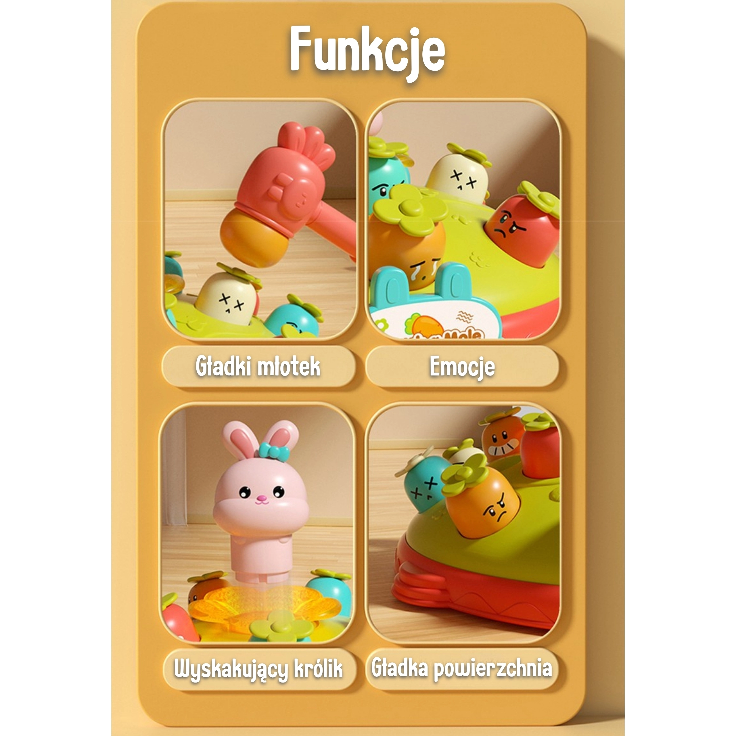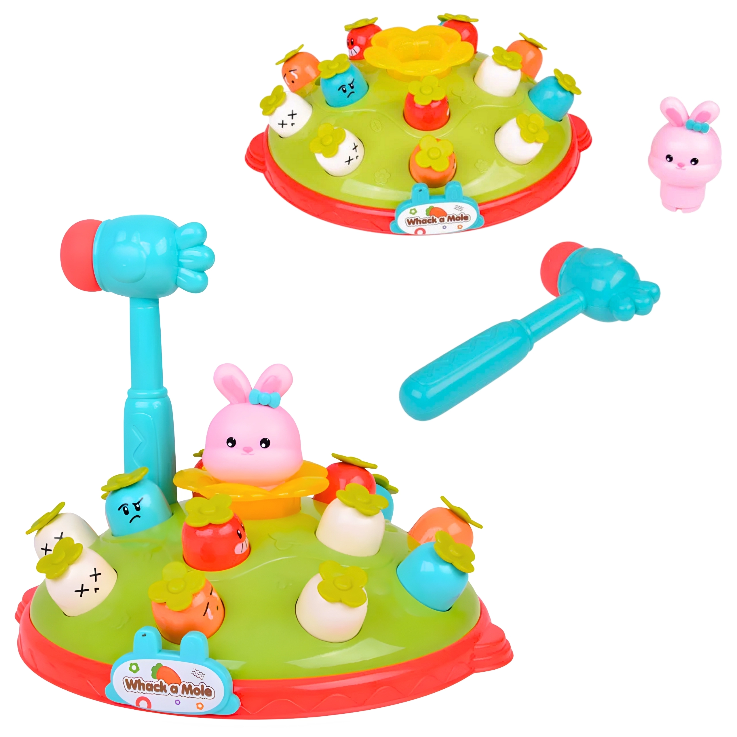 Un joc interactiv distractiv și sigur de la marca WOOPIE aduce copiilor de la 18 luni ore de bucurie și învățare. Copiii lovesc „cârtițele” cu un ciocănel moale și își îmbunătățesc astfel reflexele, coordonarea mână–ochi și concentrarea. Luminile colorate, melodiile vesele și designul prietenos cu morcovișori și iepurași sporesc motivația pentru joc. Jocul este realizat din materiale de calitate, are margini netede și un ciocănel moale pentru siguranța maximă a mânuțelor mici.
