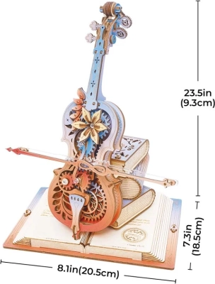 Violoncelul fermecat este un puzzle mecanic din lemn, stilat, și o cutie muzicală într-un singur obiect. După asamblare, arcusul se mișcă fluid, roțile dințate prind viață în liniște, iar pe vârf se rotește o crin elegant. Întregul ansamblu se sprijină pe un soclu ce amintește de cărți deschise – simbol al imaginației și artei, transformând modelul într-o decorațiune deosebită pentru living, birou sau camera de studenți.