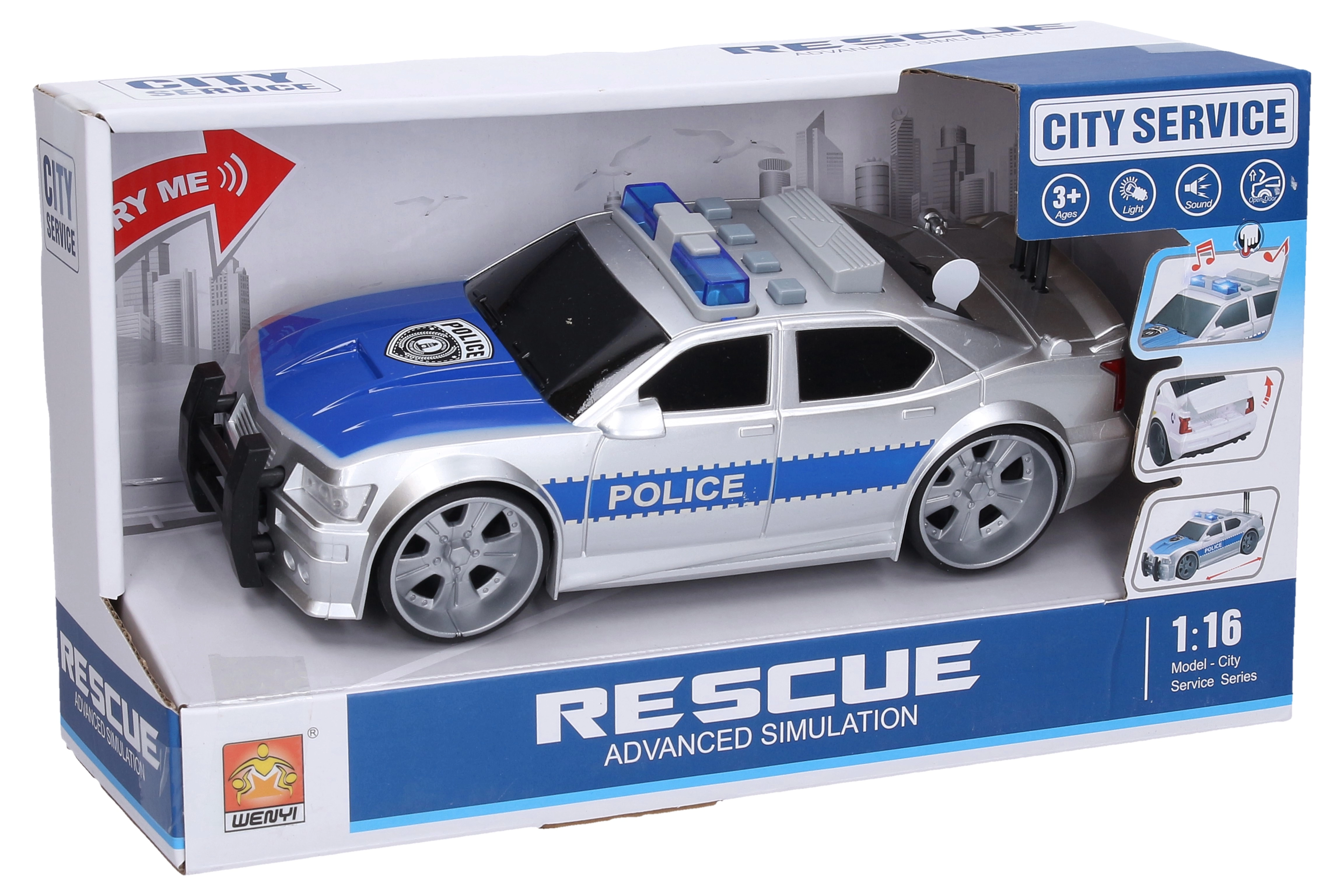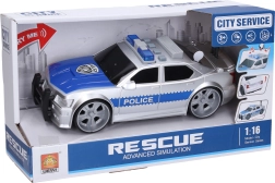 Mașina de poliție realistă cu mecanism inerțial îi va încânta pe micii și marii fani ai acțiunii. Oferă efecte luminoase și sonore, capotă rabatabilă la apăsarea unui buton și manevrare ușoară datorită mecanismului inerțial. Bateriile sunt incluse, astfel încât distracția poate începe imediat.