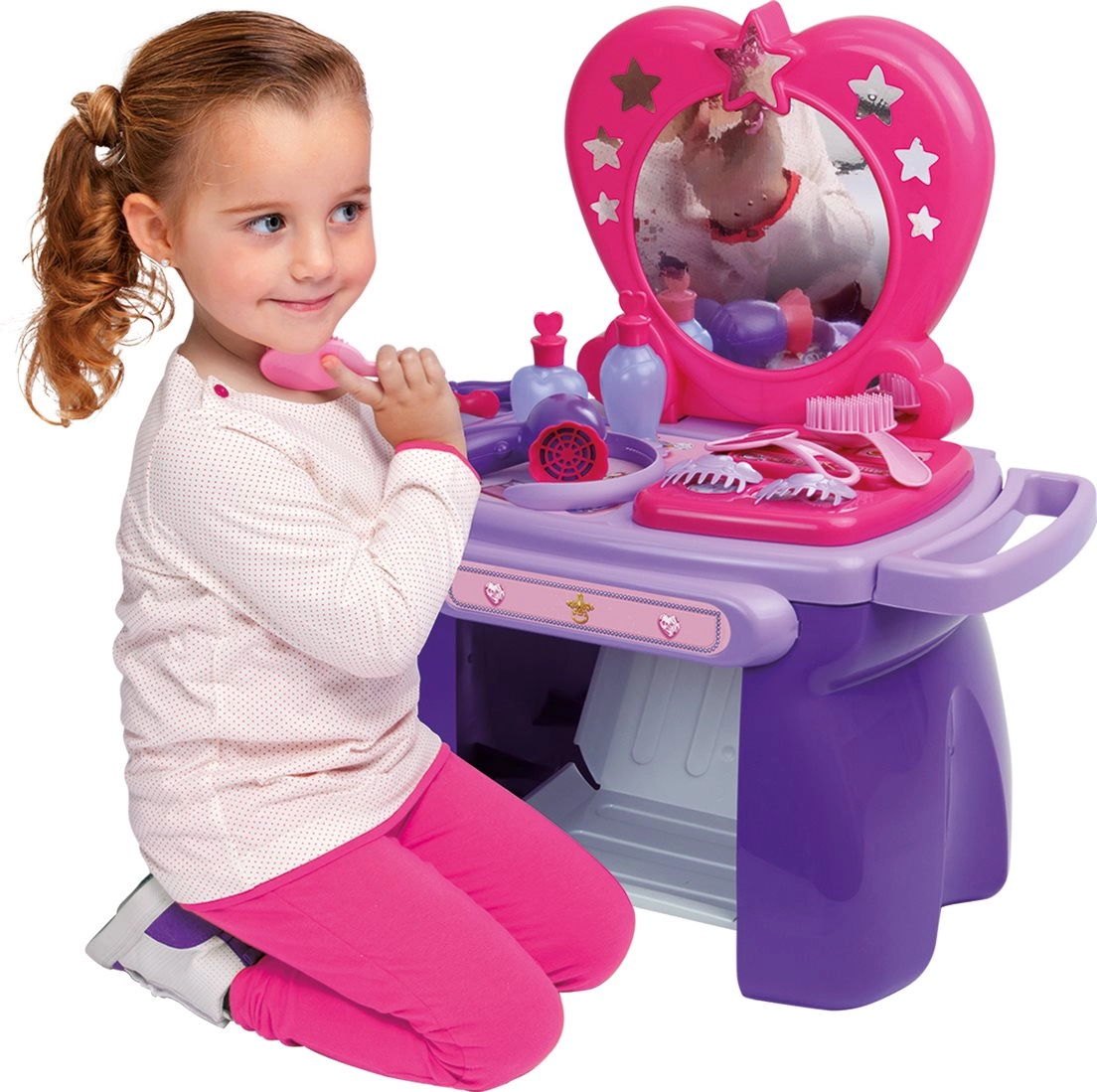 Măsuța de toaletă Lovely Princess de la CHICOS transformă orice cameră de copil într-un mic regat al frumuseții. Datorită oglinzii în formă de inimă, suprafețelor laterale de depozitare și spațiului de stocare, copiii au totul la îndemână pentru distracție deosebită. Setul include și un scăunel confortabil, astfel încât micile cochete să se poată juca ca la o măsuță de toaletă adevărată.