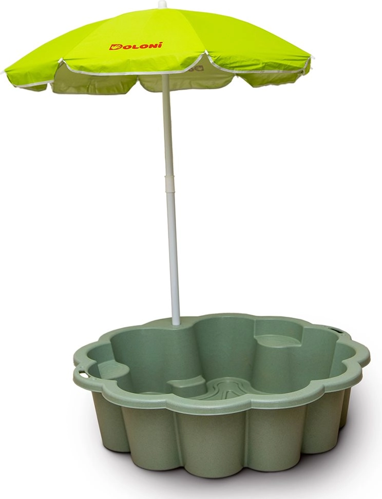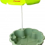 Umbrela practică protejează de soarele direct, iar cele două locuri de ședere interioare oferă spațiu confortabil pentru a sta și a se juca. Construcția ușoară, dar stabilă, se curăță ușor și face față fără probleme jocului zilnic al copiilor.