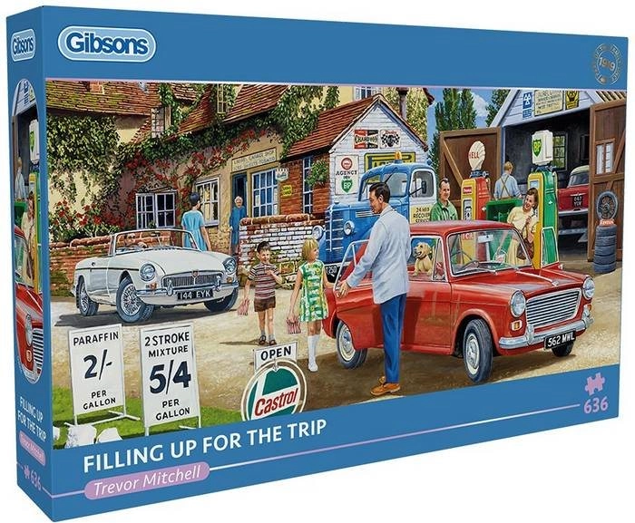 Puzzle-ul panoramic GIBSONS „Rezervare de carburant înainte de drum” este alegerea ideală pentru iubitorii ilustrațiilor detaliate și ai relaxării liniștite. Datorită celor 636 piese rezistente, vă veți bucura de o asamblare fluentă, iar la final veți fi răsplătiți cu o scenă impresionantă cu atmosferă de călătorie.