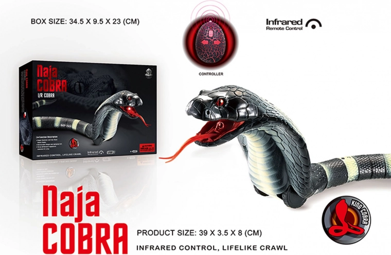 Șarpele RC COBRA realist pentru copii de la 6 ani impresionează prin mișcarea sa naturală și efectele sale. Se deplasează în trei direcții (înainte, dreapta, stânga), se târăște ca un șarpe adevărat, își scoate limba și are gura iluminată. Coada din 21 de segmente asigură o mișcare lină și rapidă. Control pe frecvența 2,4 GHz cu ajutorul telecomenzii în formă de ou. Acumulatorul reîncărcabil de 3,7 V este inclus în pachet, la fel ca bateriile pentru telecomandă.