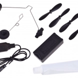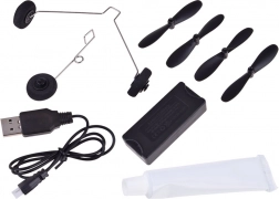 - Avion, 4× elice, 2× stabilizator orizontal, 2× roți, cablu USB, telecomandă, tub cu lipici