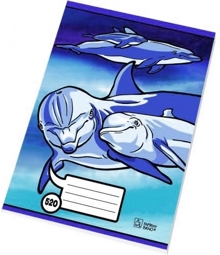 Caiet școlar practic, format A5, cu motiv cu delfini, oferă 20 de foi simple din hârtie de calitate fără lemn. Datorită gramajului mai mare, cerneala nu pătrunde, asigurând scriere și desen curate și ordonate.