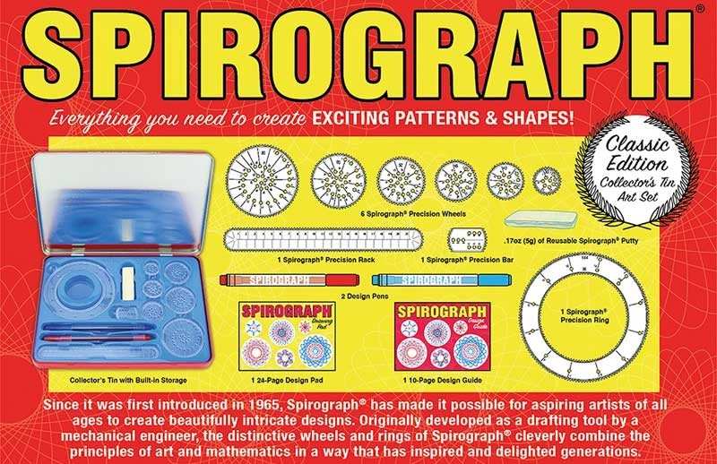 Întoarce-te la originile celebrei jucării creative. SPIROGRAPH Retro Tin este o ediție stilată într-o cutie de tablă, cu grafică inspirată de versiunea originală. Cu ajutorul rotițelor și inelelor dințate creezi cu ușurință mandale, ornamente și modele spiralate, pe care le poți colora ulterior.