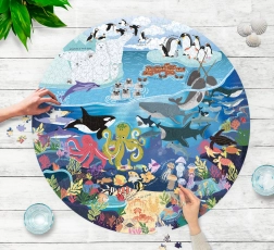 Acest puzzle rotund, stilat, este alegerea perfectă pentru oricine iubește lumea marină și caută o provocare cu un rezultat elegant. Datorită celor 1000 de piese tăiate cu grijă și formatului rotund, oferă o experiență de asamblare atipică și o decorațiune impresionantă după finalizare.