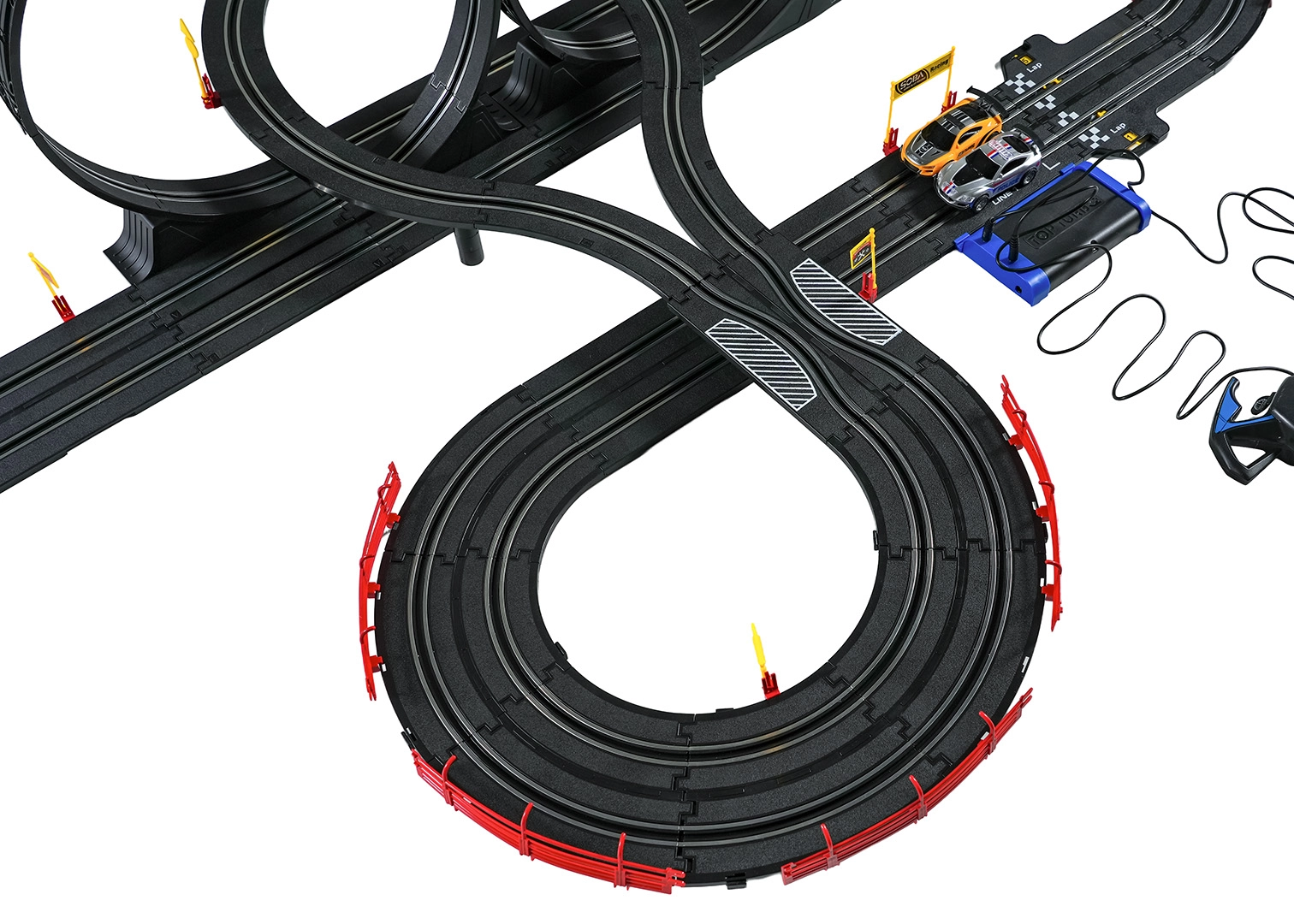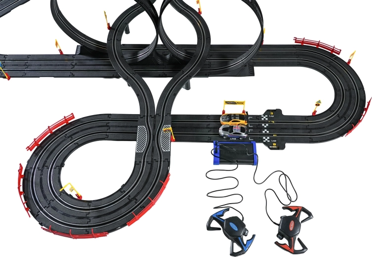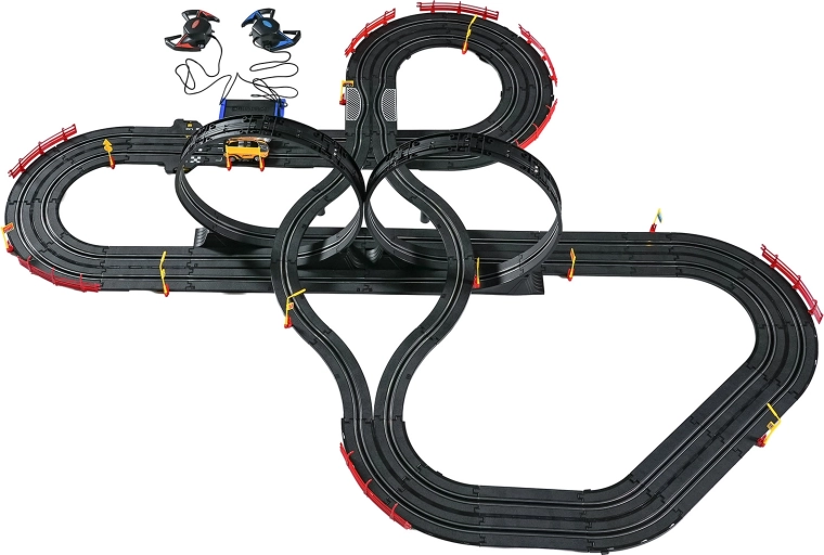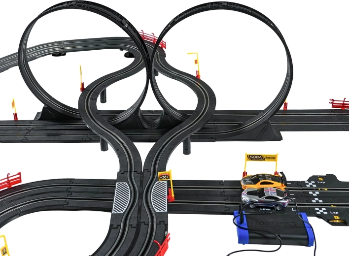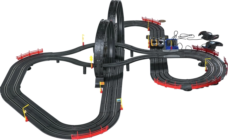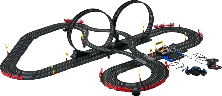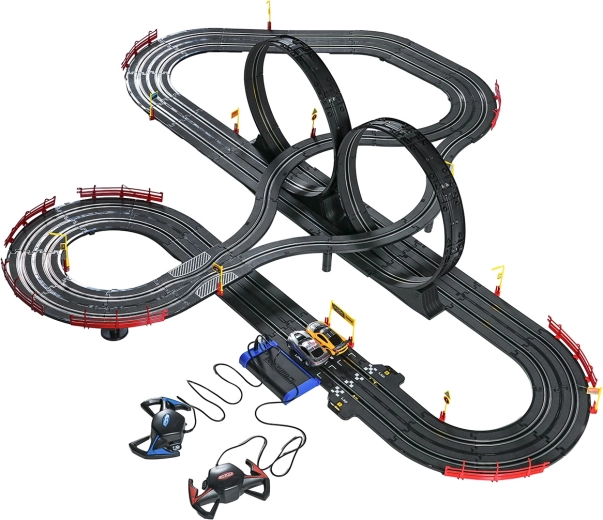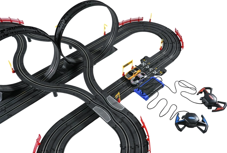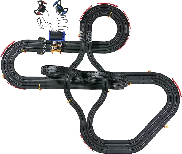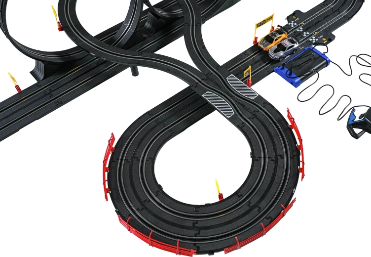 Elementele modulare cu parapeți de siguranță permit o rulare stabilă chiar și în cele mai rapide porțiuni. Cele două controlere pot fi conectate la bază sau alimentate cu baterii, astfel încât ai libertatea să concurezi după propriile reguli. Datorită traseului lung, există spațiu pentru depășiri, strategie de pilotaj și finișuri dramatice.