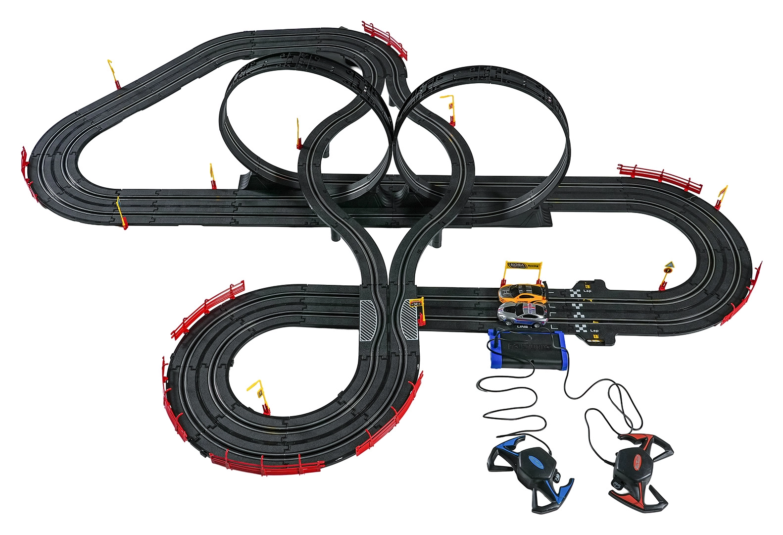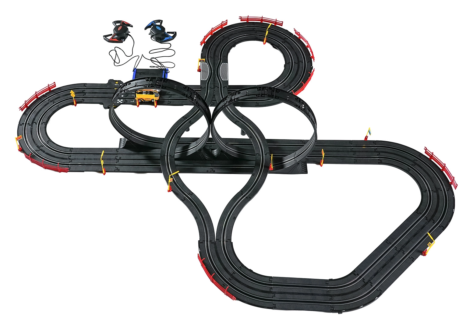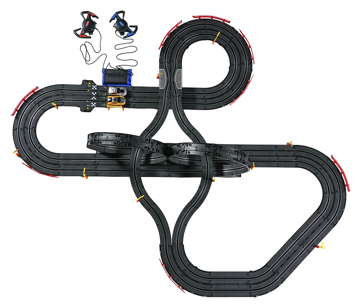 Elementele modulare cu parapeți de siguranță permit o rulare stabilă chiar și în cele mai rapide porțiuni. Cele două controlere pot fi conectate la bază sau alimentate cu baterii, astfel încât ai libertatea să concurezi după propriile reguli. Datorită traseului lung, există spațiu pentru depășiri, strategie de pilotaj și finișuri dramatice.