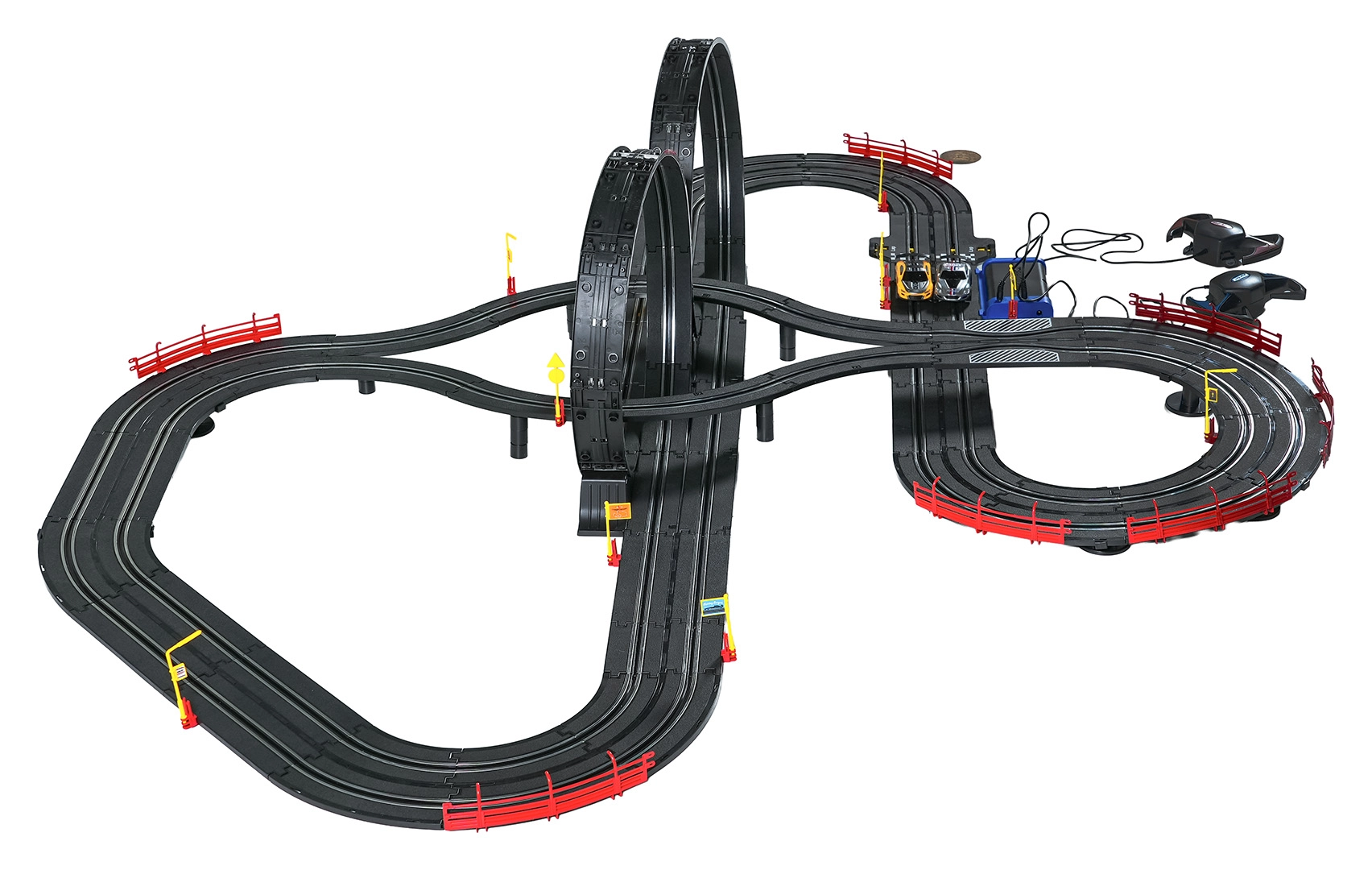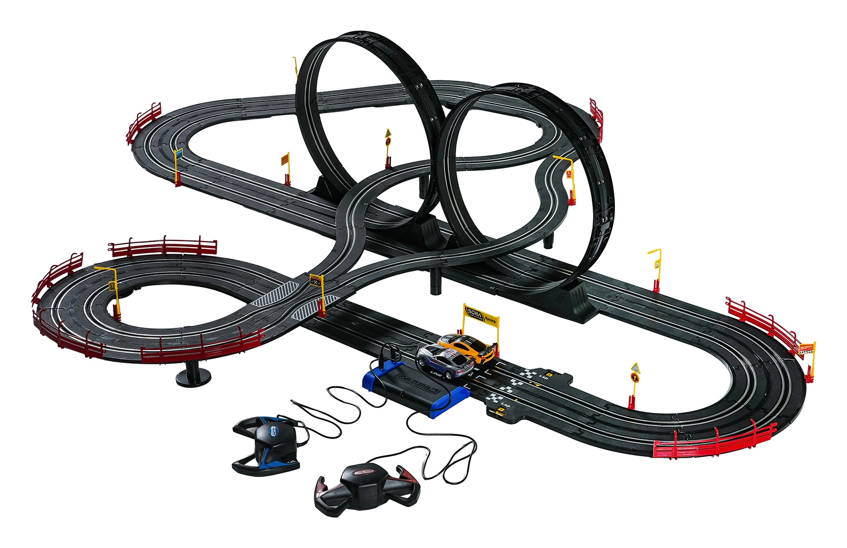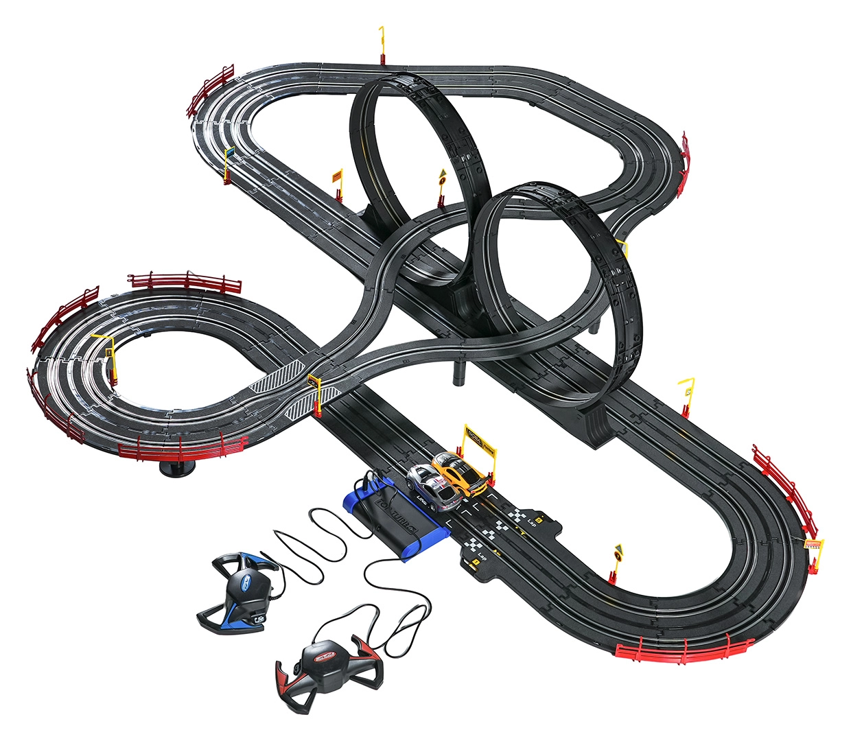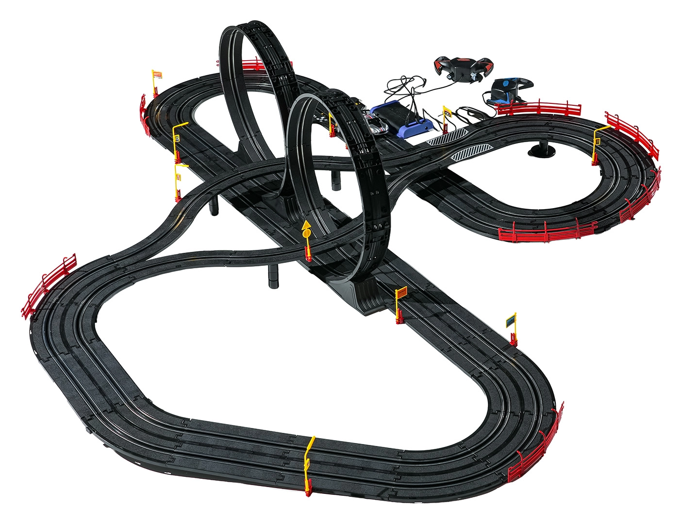 Elementele modulare cu parapeți de siguranță permit o rulare stabilă chiar și în cele mai rapide porțiuni. Cele două controlere pot fi conectate la bază sau alimentate cu baterii, astfel încât ai libertatea să concurezi după propriile reguli. Datorită traseului lung, există spațiu pentru depășiri, strategie de pilotaj și finișuri dramatice.