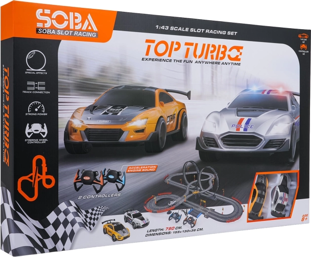 Construiește-ți propriul circuit de curse cu bucle duble și segmente înălțate, unde contează atât viteza, cât și precizia. Pista TOP TURBO XXL este concepută pentru copii de la 8 ani și pentru pasionați adulți, oferind control lin al vitezei, lumini la mașinuțe și sunete de motor pentru o experiență și mai realistă.