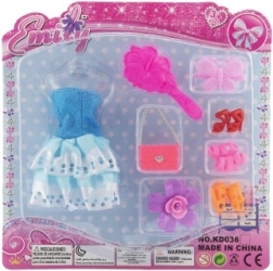 - 1× rochie, 3× perechi de pantofi, 1× poșetă, 1× agrafă de păr, 1× pieptăn, 1× elastic cu floare