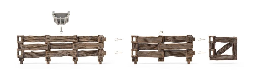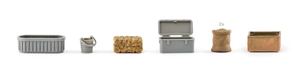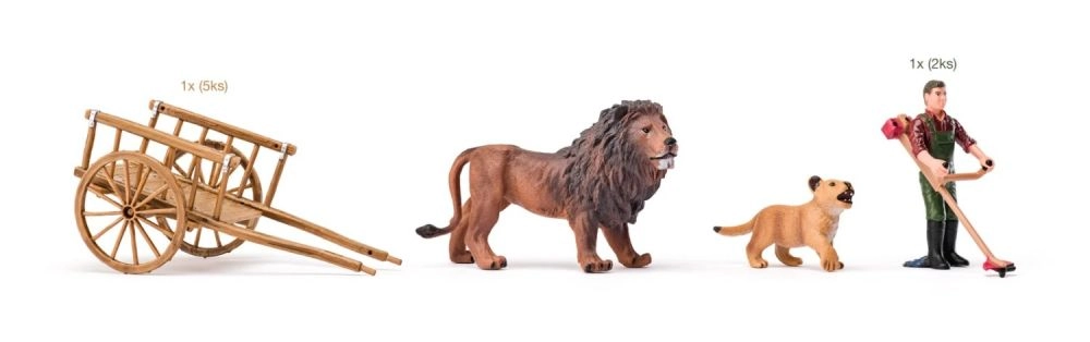 - Căsuță ridicată cu balustradă și scară, țarcuri, cărucior, miniunelte, figurină om, figurine de animale (ex. elefant, pui de elefant, girafă, zebră, mânz de zebră, leu, crocodil, hipopotam, antilopă, porc cu negi, suricată, păsări etc.)