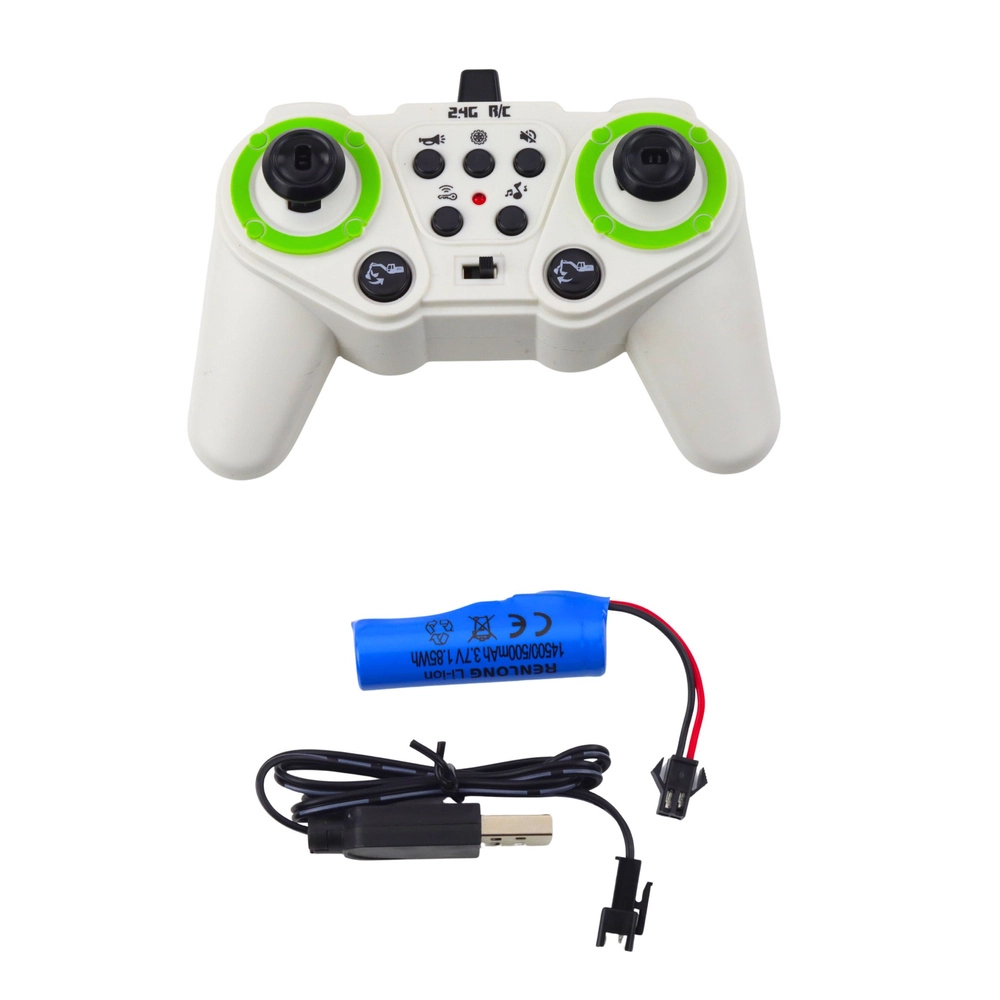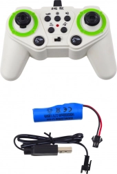 Modelul este alimentat de acumulator 3,7 V (inclus în pachet), iar telecomanda necesită baterii 3× AA 1,5 V (neincluse). Construcția durabilă din plastic cu elemente metalice asigură o durată de viață mai lungă și o stabilitate mai bună în timpul mersului.