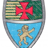 - Fundal albastru, blazon cu leu, cruce cavalerescă, chenar decorativ