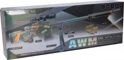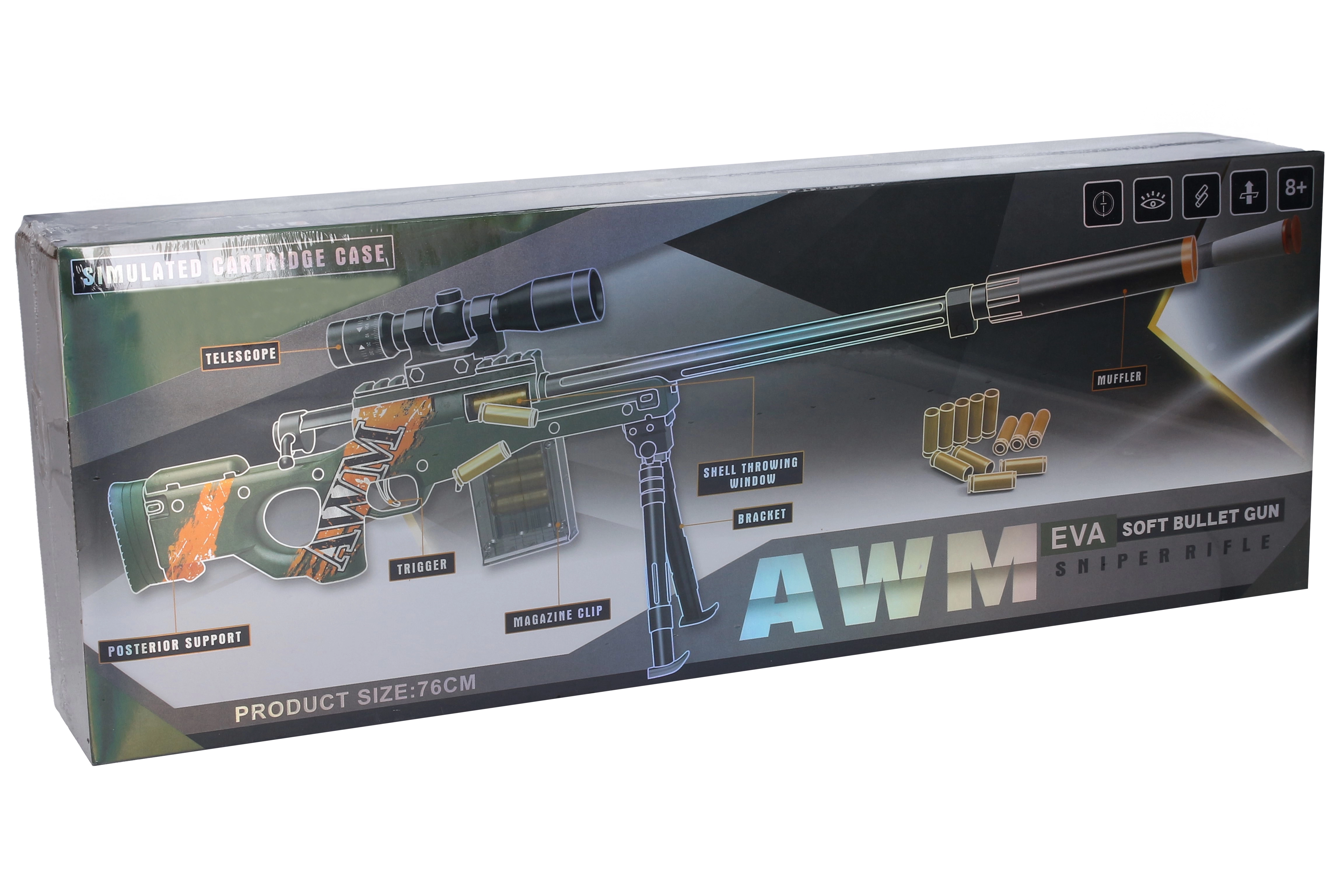 O pușcă pentru copii realistă, inspirată de modelul AWM, care îi va încânta pe micii pasionați de jocuri de acțiune. Oferă construcție demontabilă, lungime de 76 cm, trepied, amortizor și ochire pentru țintire mai bună. Pachetul include 10 cartușe și 10 gloanțe din spumă. Pe partea din spate a ambalajului găsiți instrucțiuni ilustrate pentru asamblare și utilizare.