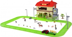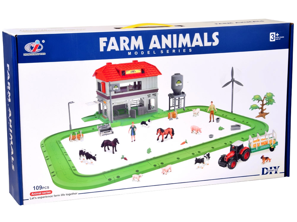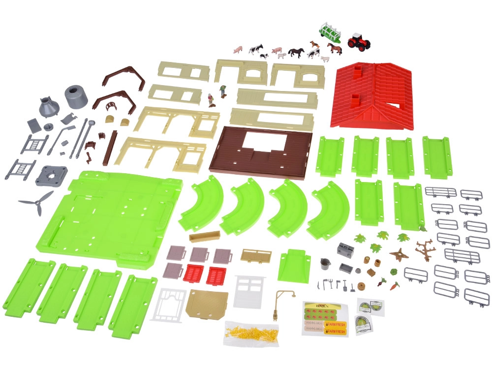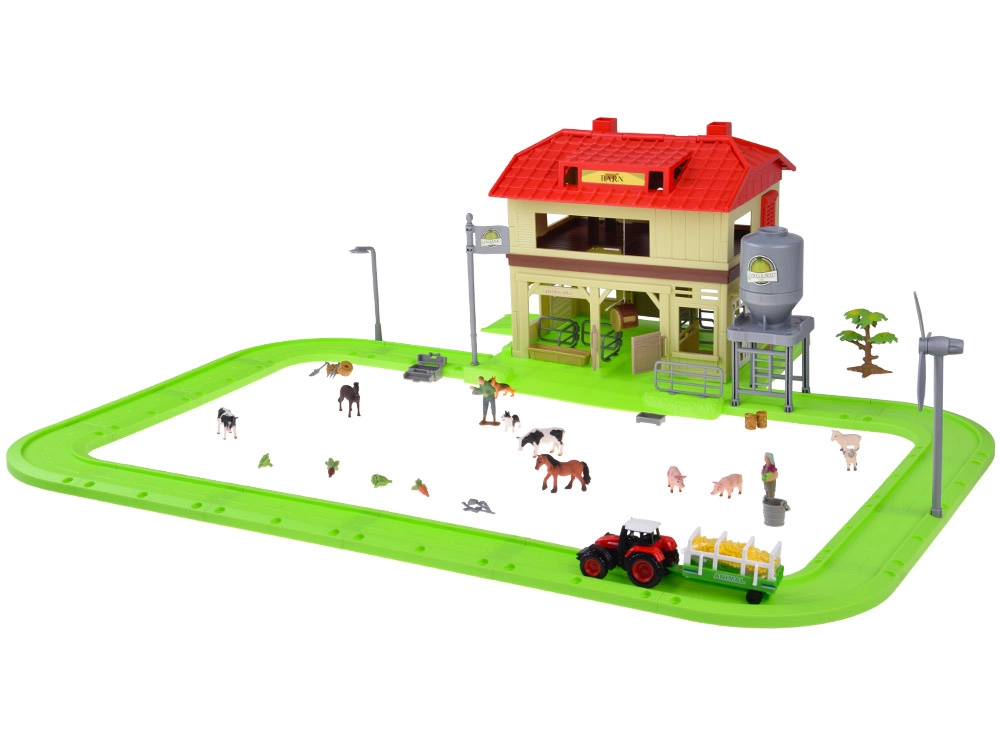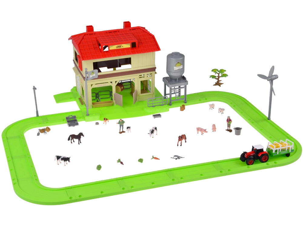 Acest set complex transformă camera copilului într-un mic colț rural. Copiii pot hrăni animalele, transporta fânul cu tractorul cu remorcă, deschide acoperișul șurii pentru acces ușor în interior și folosi silozul pentru turnarea și vărsarea furajelor. Traseul/pista verde conectează toate părțile fermei într-o singură scenă plină de joc.