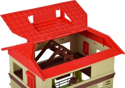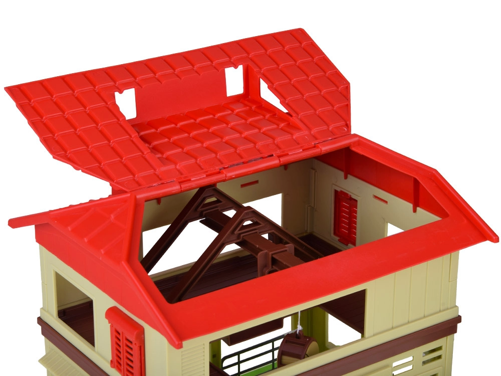 Șura cu acoperiș roșu se poate deschide pentru aranjarea ușoară a interiorului. Mânerul mobil adaugă autenticitate și susține motricitatea fină.