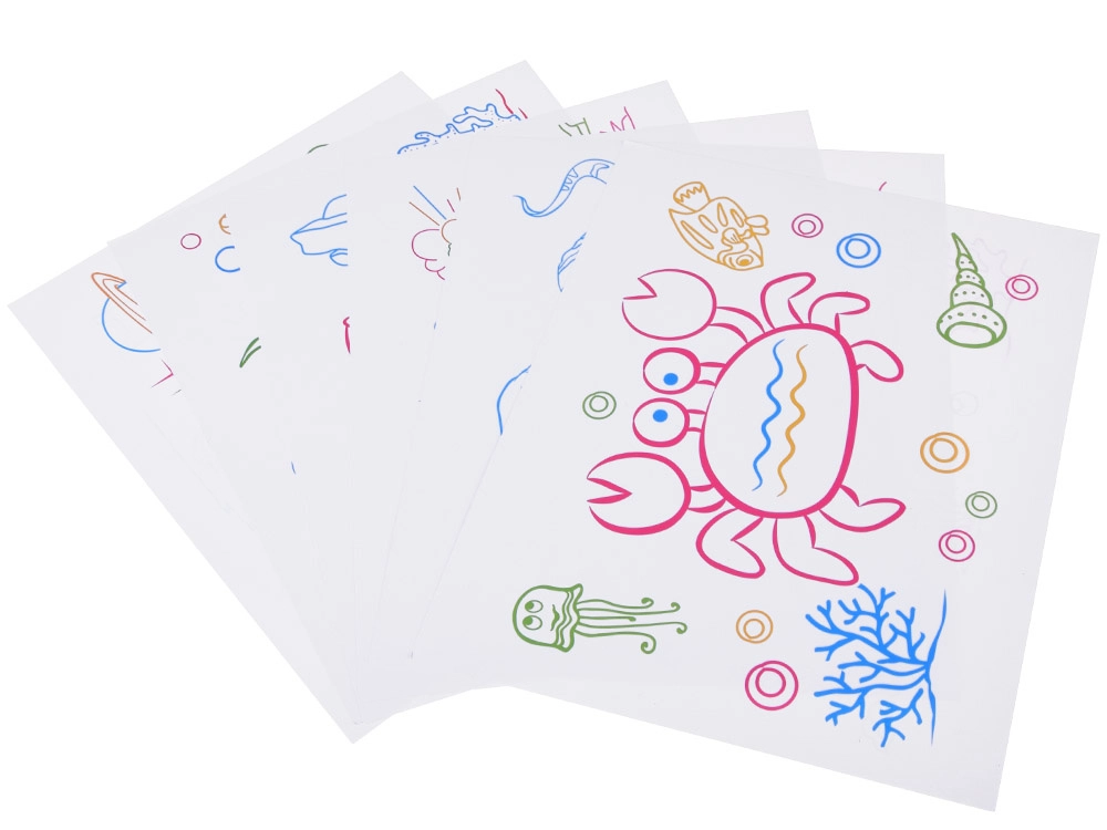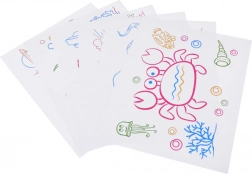Sunt incluse șabloane față-verso cu motive marine. Copiii le pot introduce în spatele panoului și pot contura comod primele desene.